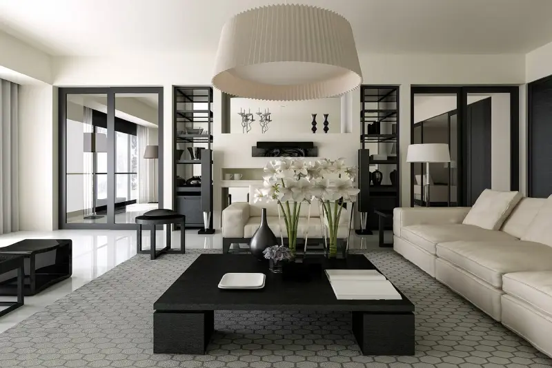 Contemporary 3BHK Flat Design with Black and White Accents Living Room