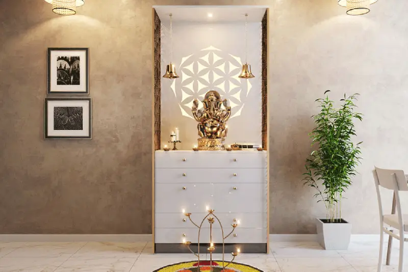 Modern Pooja Unit Design with Geometric Cutout and Warm Wooden Backdrop