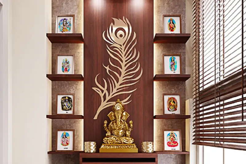 Modern Pooja Unit Design with Geometric Cutout and Warm Wooden Backdrop